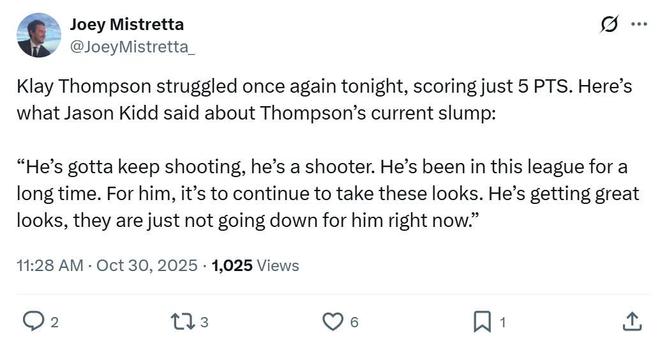 在球队遭遇严重伤病困扰的情况下,独行侠也只能期待克莱尽快回暖,赛后基德就公开表示他是个射手,已经在联盟中征战多年,他必须继续出手,那些都是绝佳的机会,只是没有命中罢了。